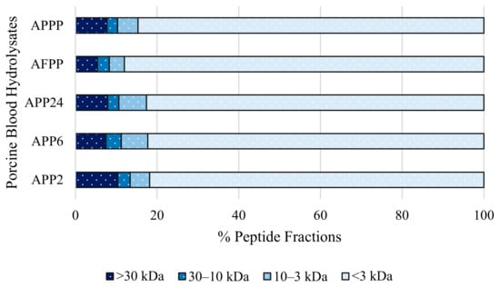 As can be seen in Figure 3, the use of different enzymes not only influences the degree of hydrolysis but also the peptide profile of the hydrolysates. According to the peptide profile, a direct relationship between an increase in DH and a greater presence of peptides with a molecular size of less than 3 kDa can be observed. Following this trend, AFPP hydrolysate, which obtained the highest DH, also has the largest fraction, with peptides <3 kDa representing 87.98 ± 1.12% of the hydrolysate.