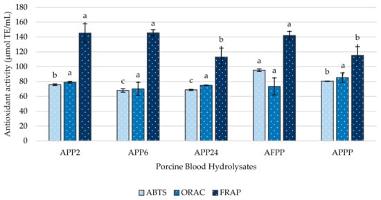 Antioxidant activity of porcine blood hydrolysates measured using ABTS, ORAC, and FRAP assays. Values were obtained via the mean of three replicates. Bars with different letters show significant differences between samples (p < 0.05).