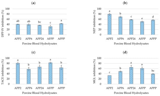 Bioactivities of porcine blood hydrolysates measured through the inhibition of different enzymes: (a) DPP-IV; (b) NEP; (c) TACE; (d) MGL. Values calculated as the average of three replicates. Bars labeled with different letters indicate significant differences between samples (p < 0.05).