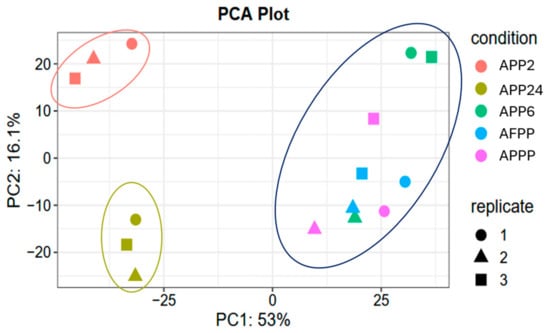 All hydrolysates were analyzed by LC-MS/MS for characterization of the peptides present in each hydrolysate. A total of 539 peptide sequences were identified in the APP2 hydrolysate: 142 in APP6, 241 in APP24, 100 in AFPP, and 124 in APPP. These peptides came from 675 pattern proteins, and 311 exhibited significant differences between samples. In this context, Figure 6 presents the principal component analysis (PCA) plot of the peptides of the processed samples. The results revealed three different clusters, with principal component 1 accounting for 53% of the observed variance, while principal component 2 explained 16.1%.