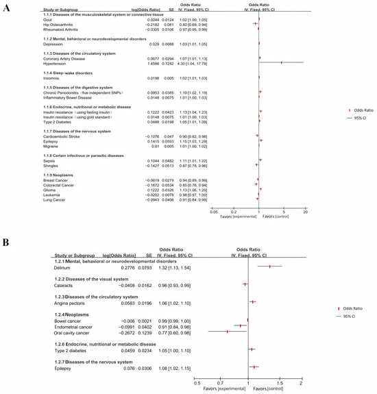 | Disease Category | Specific Disease | OR [95% CI] | p-Value 1 | Effect 2 | Directionality 3 |