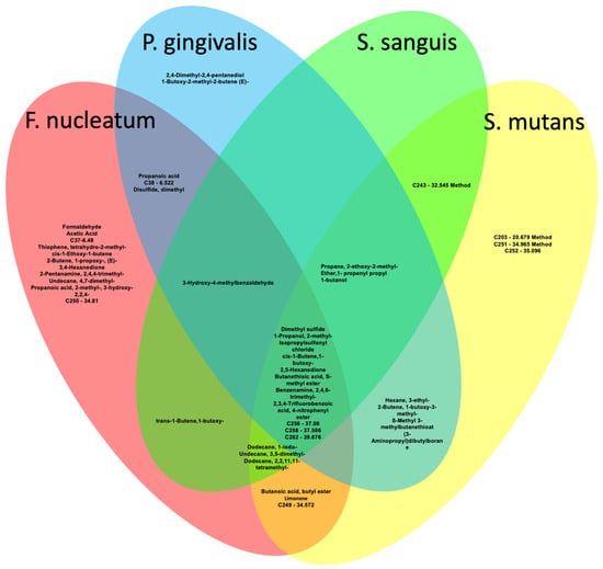 Venn diagram of signature VOCs of Fusobacterium nucleatum, Porphyromonas gingivalis, Streptococcus sanguis, and Streptococcus mutans.