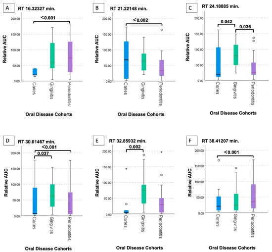 Specifically, noteworthy distinctions were observed between the caries and gingivitis groups at retention times RT = 24.18 (p = 0.042), RT = 30.01 (p = 0.037), and RT = 32.85 (p = 0.002). Additionally, a significant difference was identified between the periodontitis and gingivitis groups at retention time 24.18 (p = 0.036), and between caries and periodontitis at RT = 16.32 (p ≤ 0.001), RT = 21.22 (p ≤ 0.002), RT = 30.01 (p ≤ 0.001), and RT = 38.41 (p ≤ 0.001) (Figure 2A–F). Utilizing the NIST14 database, a total of six VOCs were tentatively identified (16.32—Propanoic acid 2-2dimethyl (isobutyric acid), 21.22—Benzaldehyde, 24.18—Undecane 2-methyl, 30.01-1-iodododecane, 32.85-Carbonic acid, 38.41—Phenyl-4-azafluorenone, or Ethylene brassylate, or 9,10-Phenanthrenedione).