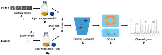 Stage I: Four cariogenic and periopathogenic reference microbial strains underwent cultivation (AI) in hermetically sealed 500 cm3 bottles, incubated at 37 °C for 48 h to promote bacterial growth (BI). The headspaces above the colonies were transferred to adsorbent tubes (C). The collected samples were desorbed (D) and injected into a GC-MS system (E). Statistical analysis was conducted on the peaks and areas under the curve of each sample’s chromatograms (F). Stage II: Adult participants (N = 60) were clinically categorized into three groups—caries, gingivitis, and periodontitis. Microbial specimens were obtained via intraoral swabbing of each participant (AII). The intraoral samples were cultured in sealed 500 cm3 bottles and incubated under anaerobic conditions at 37 °C for 72 h to facilitate microbial growth (BII). Samples were processed and analyzed under similar conditions as Stage 1.