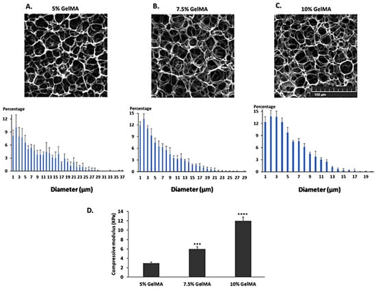 Characterization of the GelMA hydrogels. Representative scanning electron microscopy images of (A) 5% GelMA, (B) 7.5% GelMA and (C) 10% GelMA hydrogels. Lower panels display the distribution of pore sizes, after pore diameter was analyzed on the ImageJ software (version 1.54g). (D) Compressive moduli of 5%, 7.5% and 10% GelMA hydrogels. The data summarize results from at least 3 independent experiments. One-way ANOVA: *** p < 0.001 and **** p < 0.0001.