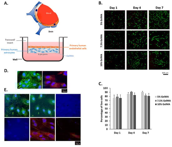 The viability of primary human astrocytes cultured as shown in Figure 2A was assessed using the LIVE/DEAD™ Cell Viability/Cytotoxicity Kit, according to the manufacturer’s instructions. Figure 2B shows live cells fluorescing in green and dead cell nuclei stained red, in 5%, 7.5% and 10% GelMA hydrogels on days 1, 4 and 7 post-seeding. In particular, astrocytes have increased in number and extended their processes into the GelMA hydrogel. Figure 2C shows the percentage of live cells, counted from different fields of the fluorescent micrographs. We observed a high viability (~80%) across the different concentrations of GelMA hydrogels (Figure 2C). The highest viability was observed with the 5% GelMA hydrogels with greater than 90% viability after 7 days in culture. For the remainder of the study, the 5% GelMA hydrogel was used to study the growth of primary human aortic endothelial cells (HAECs) with the primary human astrocytes and the establishment of a functional barrier. Figure 2D depicts zonula occludens (ZO)-1-stained HAECs and glial fibrillary acidic protein (GFAP)-positive primary human astrocytes seeded in 5% GelMA hydrogel, and Figure 2E is a representative optical sectioning (3 µm-thick z-stacks) of an HAEC–astrocyte-seeded insert, across the height of the insert, showing HAECs and astrocytes at different levels of the GelMA hydrogel (evocative of Figure 2A).