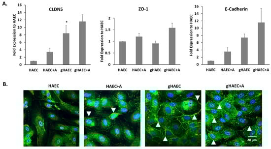 Expression of tight junction proteins by HAECs grown on GelMA hydrogels with or without astrocytes. (A) Normalized gene expression of tight junction markers CLDN5 and ZO-1 and adherens junction marker E-cadherin by HAECs. (B) Immunofluorescence micrographs of ZO-1 expressed by HAECs (green). Nuclei are stained with DAPI (blue). White arrowheads indicate points of cell-to-cell contact. HAEC: HAECs cultured on inserts. HAEC+A: co-culture of HAECs and astrocytes on inserts. gHAEC: HAECs cultured on GelMA. gHAEC+A: co-culture of HAECs on top of astrocytes in a scaffold made of GelMA. Data summarize results obtained from at least 3 independent experiments, run in duplicate (for qRT-PCR). One-way ANOVA * p < 0.05.