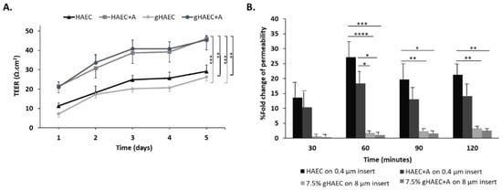 Assessment of the barrier function of the developed BBB models. (A) TEER of HAEC measured for 5 days. (B) EBA permeability assay. At 120 min, all conditions are compared to gHAEC+A, and change of permeability is reported as a function of insert pore sizes. Error bars represent the standard error of the mean from at least 4 independent experiments. Two-way ANOVA: * p < 0.05, ** p < 0.01, *** p < 0.001, **** p < 0.0001. HAEC: HAECs cultured on 0.4 μm-pore inserts. HAEC+A: co-culture of HAECs and astrocytes on 0.4 μm-pore inserts. gHAEC: HAECs cultured on GelMA in 8 μm-pore inserts. gHAEC+A: co-culture of HAECs on top of astrocytes in a scaffold made of GelMA on 8 μm-pore inserts.