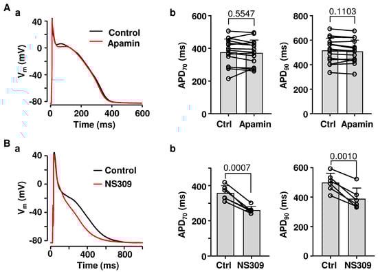 Effect of SK channel inhibition and activation on atrial APD. (A): (a) Overlay of APs recorded from the same atrial myocyte in control and after application of SK channel blocker apamin (100 nM) at 1 Hz stimulation. (b) Mean ± SD and individual APD70 and APD90 values in control (Ctrl) and in apamin (n/N = 15/10; paired t-test). (B): (a) Overlay of APs recorded from the same cell in control and after application of SK channel activator NS309 (2 µM). (b) Mean ± SD and individual APD70 and APD90 measurements in control and after application of NS309 (n/N = 6/2; paired t-test).