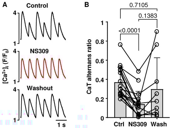 Alternans is a well-established risk factor for cardiac arrhythmias, including AF [,,,]. AP morphology was shown to modulate the risk of cardiac alternans [,]. Therefore, we tested if SK channel activation in atrial myocytes has an effect on APD and CaT alternans. APD and CaT alternans were induced by increasing the pacing frequency. Figure 2A shows CaT traces recorded from the same field-stimulated atrial cell in control, in the presence of the SK channel activator NS309 (2 µM) and after the washout of NS309. SK channel activation consistently abolished or attenuated the degree of atrial CaT alternans. NS309 reduced mean CaT alternans ratio (AR) from 0.37 ± 0.16 to 0.14 ± 0.13 (Figure 2B; n/N = 17/6; p < 0.0001; Tukey’s mixed-effects multigroup comparison). In a subset of cells (n/N = 9/3) a washout of NS309 resulted in an increase in CaT AR to 0.30 ± 0.32, which was statistically not different from control AR.