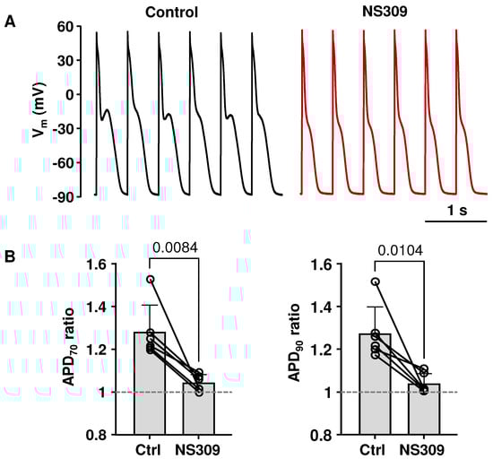 Activation of SK channels by NS309 also abolished or reduced the degree of pacing-induced APD alternans. Figure 3A shows APs recorded from a current-clamped myocyte in control and after application of NS309. To quantify AP alternans, we calculated APD70 and APD90 ratios by dividing the longer APD by the shorter APD of alternating AP pairs (Figure 3B). Accordingly, ratio values of 1 indicate the absence of alternans. In the presence of NS309, the APD70 alternans ratio decreased from 1.28 ± 0.1 to 1.05 ± 0.04 (p = 0.0084; paired t-test), and the APD90 ratio decreased from 1.27 ± 0.12 to 1.04 ± 0.05 (p = 0.0104).