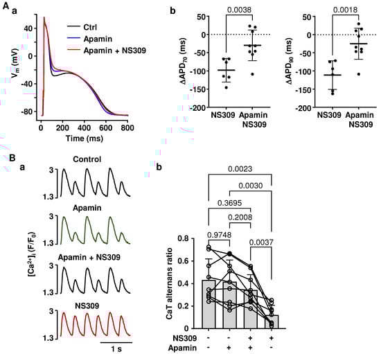 The specificity of pharmacological agents used in research is a common and valid concern. To determine whether the effects of NS309 were indeed elicited selectively by the activation of SK channels, we performed experiments where the SK channel blocker apamin was applied together with NS309. Figure 4(Aa) shows AP traces in control, in apamin (100 nM), and in the presence of apamin together with NS309 (2 µM). The data show that the presence of apamin prevented NS309 from shortening the AP. In addition, Figure 4(Ab) shows that apamin largely reversed the APD shortening (APD70 and APD90) elicited with NS309. We also tested if SK channel inhibition with apamin prevents the rescuing effect of NS309 on CaT alternans (Figure 4B). Once stable pacing-induced alternans were established, CaT alternans were recorded for at least 1 min under control conditions, and then myocytes were superfused with apamin for 3–4 min, followed by simultaneous exposure to apamin and NS309. After 3–4 min, apamin was removed, leaving the same cells exposed to NS309 alone. During these experiments, mean CaT AR in control was 0.43 ± 0.19, 0.42 ± 0.19 in apamin, and 0.34 ± 0.13 in the presence of apamin together with NS309 (Figure 4(Bb); n/N = 9/5, no statistically significant differences between CaT ARs for these different experimental conditions; Tukey’s multiple groups comparison test). When cells were subsequently exposed to NS309 alone, the mean CaT AR decreased to 0.12 ± 0.09 (p = 0.0023 vs. control and p = 0.0037 vs. NS309 + apamin), similar to the above reported (Figure 2) decrease in AR. From the observation that the effects of NS309 were abolished by SK channel inhibition, we conclude that NS309 induced APD shortening and rescue of CaT alternans are caused by the activation of SK channels.