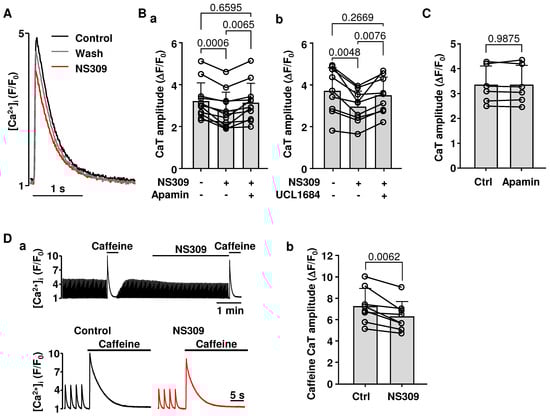 We tested if activation of SK channels affects intracellular Ca2+ release in atrial myocytes (Figure 5). CaTs (Figure 5A) were monitored in field-stimulated cells paced at 0.5 Hz (i.e., at a frequency that did not elicit alternans). In two sets of experiments exposure to NS309 (2 µM) decreased CaT amplitude (ΔF/F0) from 3.22 ± 0.87 to 2.78 ± 0.86 (Figure 5(Ba); n/N = 11/3; p < 0.0006; Tukey’s multiple groups comparison test) and from 3.72 ± 1.10 to 2.96 ± 0.77 (Figure 5(Bb); n/N = 9/3; p < 0.0048). In addition, the effect of NS309 on CaT amplitude was abolished by the subsequent application of two different SK channel blockers: apamin (Figure 5(Ba); n/N = 11/3; p = 0.0065; Tukey’s multiple groups comparison test) or UCL1684 (Figure 5(Bb); n/N = 9/3, p = 0.0076) restored CaT amplitude to control levels, even in the maintained presence of NS309. The inhibition of SK channels alone (apamin 100 nM) had no effect on CaT amplitude (Figure 5C), and this is consistent with our findings that blocking SK channels does not affect AP repolarization (Figure 1A). In addition, the observation that the NS309 effect on CaT can be reversed by two different SK channel blockers provides further evidence that the effects of NS309 are elicited through SK channel activation.