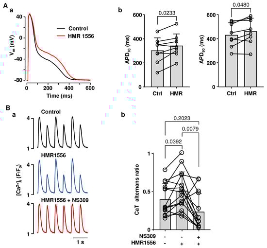 Polymorphic atrial tachycardia and AF are commonly observed in LQT syndrome patients [,,,,,,,,,,,,] and aggravate the risk of clinical complications. To mimic LQT type-1 conditions, which are linked to an increased risk of atrial arrhythmias in humans [,], we blocked Kv7.1 potassium channels with HMR1556 (1 µM). As expected, the application of HMR1556 resulted in the prolongation of the atrial AP (Figure 6(Aa)). APD70 prolonged from 303 ± 107 ms to 343 ± 98 ms (n/N = 8/5; p = 0.0233, paired t test) and APD90 from 433 ± 101 ms to 463 ± 109 ms (p = 0.0480) (Figure 6(Ab)). To test if SK channel activation could reduce the alternans risk in the LQT setting, field stimulation frequency was gradually increased until atrial myocytes exhibited stable CaT alternans, and then atrial myocytes were exposed to HMR1556 (1 µM) and to HMR1556 together with NS309. Figure 6(Ba) shows CaT alternans traces recorded in control, in HMR1556, and in HMR1556 together with NS309. The mean CaT AR in control was 0.40 ± 0.20. HMR1556 increased CaT AR to 0.50 ± 0.25 (n/N = 14/8; p = 0.0392; Tukey’s mixed effects multiple comparison test; Figure 6(Bb)). Subsequent application of NS309 during KV7.1 inhibition suppressed CaT alternans and reduced AR to 0.24 ± 0.24 (n/N = 13/7; p = 0.0079, Tukey’s mixed-effects multiple group comparison test). Consequently, our data demonstrate that simulated LQT syndrome type-1 in atrial myocytes increases the risk of proarrhythmic alternans, which can be prevented by the activation of SK channels.