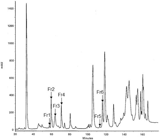 RP-HPLC separation of the proteins from Macrovipera lebetinus obtusa snake venom. The chromatogram shows absorbance at 220 nm. The fractions to be subjected to cell assays and protein identification, respectively, were collected manually and are labeled Fr1 to Fr6.