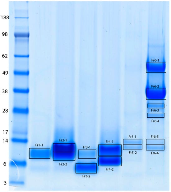 The protein composition of the MLO venom was investigated using fractionation of the crude venom by the reversed phase high-performance liquid chromatography (RP-HPLC), resulting in 38 fractions (Figure 1), which fully corresponded to the results described by Sanz et al. (2008) []. The six low-molecular weight fractions, which were supposed to contain disintegrins and PLA2 (labeled as Fr1 to Fr6 in the chromatogram), were separated by SDS-PAGE (Figure 2), and bands of interest were subjected to in-gel digestion with trypsin, followed by protein identification using matrix-assisted laser desorption/ionization time-of-flight mass spectrometry (MALDI-TOF-MS).