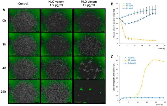 IncuCyte ZOOM® analysis for HT-1080 (fibrosarcoma) cells behavior induced by MLO snake venom (1.5 μg/mL and 15 μg/mL) after 24 h treatment. (A) Cytotox green (0.25 µM) was added after a 24 h treatment with MLO snake venom. The representative field images were acquired with IncuCyte ZOOM®. Scale bar, 300 µm (B,C). The rate of the proliferation and cytotoxicity of the HT-1080 cells after treatment with two different concentrations with MLO snake venom for 24 h (15 μg/mL and 1.5 μg/mL) (experimental repeats–3, mean ± SEM).