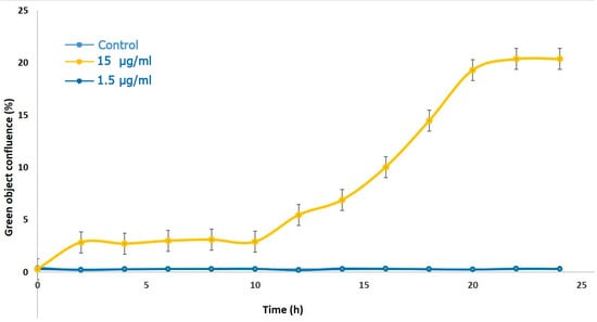 As shown in Figure 3, the influence is very potent in the case of 15 μg/mL concentration of MLO snake venom on HT-1080 cells. The cells lose their connection, and morphological change is observed 2 h after adding the venom. The cells merged, and after 10 h, the cells started to die, and all the cells almost died after 14 h. The situation is entirely different in the case of 1.5 μg/mL venom concentration. The cells again lose the junctions, changing morphology. The cell proliferation decreases by 29% and 11% after 10 h and 24 h, respectively, but without cytotoxicity.