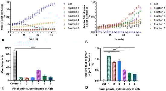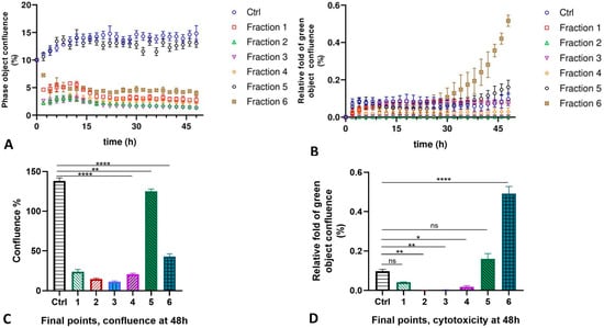 The rate of the proliferation (panels A,C) and cytotoxicity (panels B,D) of the HMVEC-D cells after treatment with six fractions isolated from the MLO snake venom for 48 h (experimental repeats–3, mean ± SEM; one-way ANOVA with Dunnett’s multiple comparison test, p * < 0.05; p ** < 0.01; p **** < 0.0001; ns—not significant).