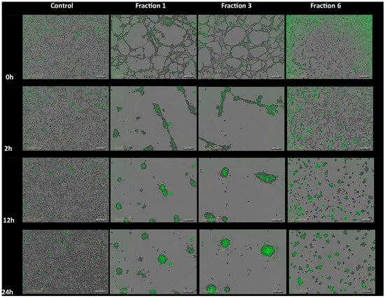 IncuCyte ZOOM® analysis for HT-1080 cells behavior induced by some MLO active fractions after 24 h treatment. Cytotox green (0.25 µM) was added after a 24 h treatment with fractions. The representative field images were acquired with IncuCyte ZOOM®. Scale bar, 300 µm. The IncuCyte® Cytotox green reagent specifically binds to DNA of dead cells due to the loss of membrane integrity. Hence, the fluorescent signal produced is proportional to the cytotoxicity.
