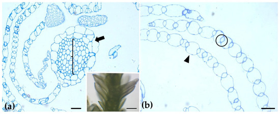 - Lu, Y.T.; Loue-Manifel, J.; Bollier, N.; Gadient, P.; De Winter, F.; Carella, P.; Goodrich, J. Convergent evolution of water-conducting cells in Marchantia recruited the ZHOUPI gene promoting cell wall reinforcement and programmed cell death. Curr. Biol. 2024, 34, 793–807. [Google Scholar] [CrossRef] [PubMed]