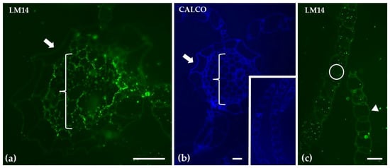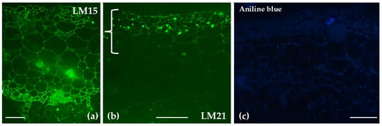 | LM13 | Pronounced labeling in photosynthetic cells; reduced signal in stem | Low signaling throughout thallus parenchyma | |