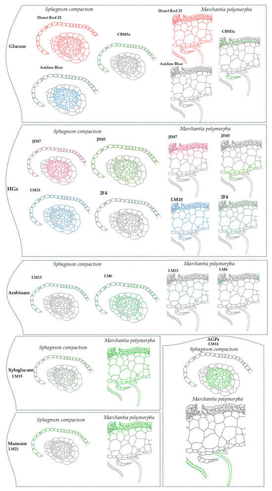 | Polysaccharide/ Protein | Antibody/ Label | Distribution in Sphagnum compactum | Distribution in Marchantia polymorpha |