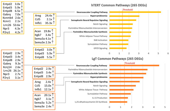 Pathway analysis was used to derive further meaning from the Venn diagram data. Tables S2 and S3 contain the pathways associated with the shared genes among the parent and the two cell lines. Figure 1 shows the top 10 shared canonical pathways for hTERT and LgT. Selected DEGs and fold changes are indicated for the top scoring pathways, such as neurovascular coupling, hypercytokinema, semaphorin neural repulsion, and pyrimidine synthesis. There was general agreement in the ranking of common pathways for the two cell lines, although variations in the fold-change intensity accounted for some differences in pathway ranking. Notable increases in expression occurred in these cells for the big potassium BK channel, Lrrc26 [46], from 26.1× to 53.6× fold; for the autocrine growth factor, Areg [47], from 24.4× to 2.4× fold; and for the extracellular matrix proteoglycan, Acan, from 19.8× to 20.1× fold, which coordinates with the semaphorin, Sema3 [48]. Careful monitoring of ATP levels is performed by the ectonucleotidase family (Entpd2,3,8) which regulates neurovascular and immune functions in kidney [49].