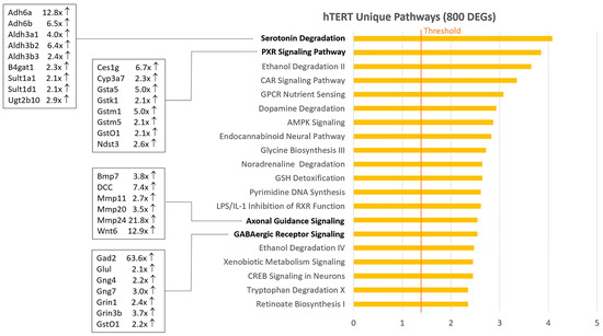 From the Venn diagram analysis, 800 DEGs unique to hTERT (Table S4) and 1262 DEGs unique to LgT (Table S5) cells were found when compared to primary proximal tubule cell expression. The top 20 pathways are shown in Figure 2 for hTERT cells and Figure 3 for LgT cells. The pathway enrichment for each unique gene set suggests different patterns of pathway activation in each cell line. The hTERT cell pathways (Figure 2) generally reflected alterations in intermediary and synaptic transmitter metabolism. For example, increases in aldehyde dehydrogenases are relevant to the degradation of serotonin, ethanol, dopamine, tryptophan, and noradrenaline. Activation of the GABAergic system was supported by increased Gad2 (enzyme for conversion of glutamic acid to GABA) that is interconnected with glycine biosynthesis. Relatedly, axon guidance pathways regulate the synaptogenesis of neurotransmitters and intravesicular transport. Other intermediary systems of interest in hTERT cells involve GSH-transferase enzymes including the PXR and CAR signaling pathways, as well as GSH conjugation reactions. Gene expression and pathway changes generally reflect adjustments in intermediary and bioenergetic metabolism in hTERT cells compared to parent cells.