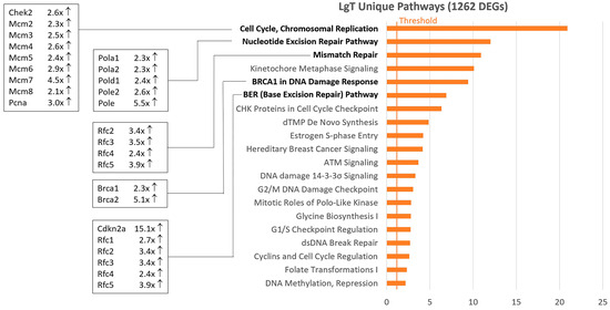 A pathway analysis of upregulated DEGs in LgT cells exhibited a somewhat different pattern of activation than hTERT cells (Table S5). Cell cycle regulation and DNA repair pathways were generally engaged in LgT cells, as shown in Figure 3. Although DEGs increase, those populating activated pathways were generally in the 2× to 3×-fold change range, and the regularity of the cell cycle and DNA repair pathway activation was apparent. Notable LgT transcript changes compared to parent proximal tubules included a 23×-fold increase in STAG3, a cohesion protein involved in sister chromatid generation during the cell cycle [50]; a 15×-fold increase in the cell cycle regulator Cdkn2a (p16Ink4a) [51]; and increases in Brca1 at 2×-fold and Brca2 at 5×-fold as mediators of ongoing chromosomal repair [52]. These events represent portions of the replication stress response involving changes in the cell cycle, DNA repair, and replication fork integrity, as recently reviewed [53].