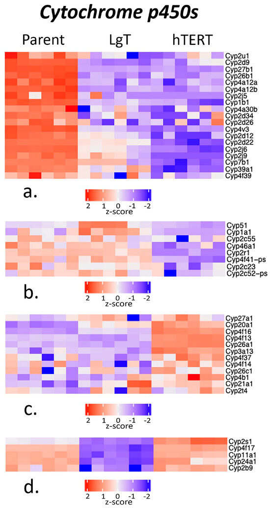 Cluster analysis of the differences in cytochrome P450 (Cyp) expression among parent, LgT, and hTERT cells. The RNA-seq base mean counts (BMCs) for each transcript (n = 6/cell type) are compared by Z-score (value range provided in the legend). Hierarchical analysis was used to separate the data into four clusters (a–d). See text for detailed description.