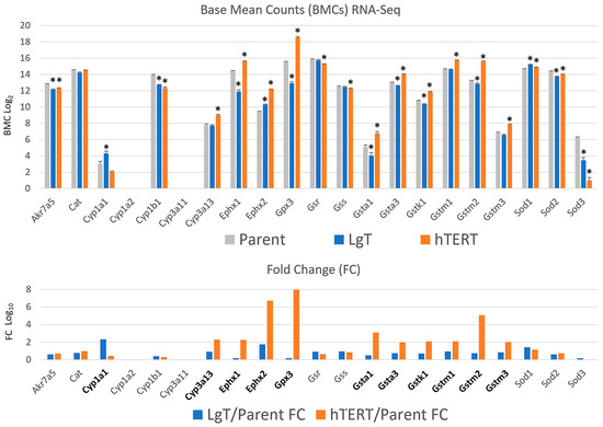 Bioactivation and detoxification transcripts for AFB1 in mouse RPTECs. Relevant ABF1 metabolism transcripts in mice have been previously described (see Section 3) and their relative expression levels in base mean counts (BMCs) are shown in the top panel. Base mean counts (mean ± S.E.M.) are shown in the top panel for the primary parent cells and LgT or hTERT cells at near confluence. Significant differences (p ≤ 0.05) from parent RPTECs are indicated by an asterisk (ANOVA and Dunnett’s post hoc test). A log2 scale was used to accommodate high- and low-expression transcripts. Note that Cyp1a2 and Cyp3a11 were not expressed in RPTECs. The lower panel shows transcript fold changes in LgT or hTERT cells compared to primary parent RPTECs. Bolded transcripts highlight those with a ≥2-fold change in hTERT (orange bars) or LgT RPTECs (blue bars) relative to parent RPTECs.