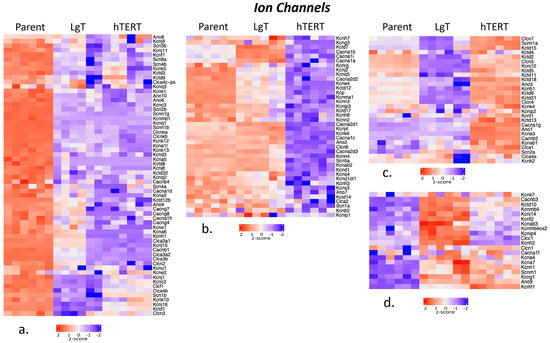 Ion channels play a critical role in renal function for maintaining Na+, K+, Cl−, and Ca2+ ion concentrations at homeostatic levels throughout the body by retaining or excreting ions as needed. For the 195 ion channels considered, Figure 6 shows that 150 transcripts met the threshold criteria of ≥5 BMCs. The transcripts were clustered into the following four groups: Group ‘a’, which has 62 parent transcripts with greater expression than LgT and hTERT cells; Group ‘b’, which has 40 parent and LgT cells with greater expression than hTERT cells; Group ‘c’, which has 28 hTERT transcripts with greater expression than parent and LgT cells; and Group ‘d’, which has 20 LgT transcripts with generally higher expression than parent and hTERT cells. Overall, the relatively reduced expression in 36 ion channel transcripts below 5 BMCs in hTERT cells suggests hTERT was the most affected cell type, followed by LgT cells with only 11 lower-expressing ion channels (Table S7).