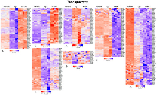 Cluster analysis of the differences in expression among metabolic transporter transcripts in parent, LgT, and hTERT cells. The RNA-seq base mean counts (BMCs) for each transcript (n = 6/cell type) are compared by Z-score (value range presented in the legend). Hierarchical analysis was used to separate data into seven clusters (a–g). See text and supplemental data tables for a detailed description.