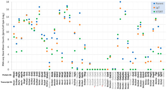 Several classes of renal transporters are of particular interest to researchers in drug development, pharmacology, and toxicology, and are generally known by their protein identities, such as the OATs (organic anion transporters), OCTs (organic cation transporters), MDRs (multidrug resistance transporters), ENTs (equilibrative nucleoside transporters), among others [61,62]. We organized a panel of 60 transporters, as shown in Figure 8, by their protein ID and corresponding transcript ID to show each transcript’s relative expression from each cell type using the means of the BMCs from the RNA-seq data. After performing a statistical analysis of the BMC data (ANOVA and Newman–Keuls), we found 45 detectable transcripts (p < 0.05, in bold), which included at least one cell type with a group mean of ≥5 base mean counts. There were 15 (in grey font) transcript/proteins at low or undetectable expression levels of <5 BMCs, including two transporters for which we could not find a consensus transcript (grey font, red asterisk), precluding their analysis (see paragraph below). Highly expressed transporter classes in all cell types included equilibrative nucleotide transporters (e.g., Ent1,-2,-3), multidrug resistance transporters (e.g., Mdr1,-2, Mrp1,-3,-4,-5, Pgp, and Bcrp), organic cation transporters novel (e.g., Octn1,-2,-3), and glucose transporters (e.g., Glut1,-2,-9). However, other transporter classes exhibited relatively low expression, including Octs (e.g., Oct 2,-3), Oats (Oat1,-2,-3,-5,-6,-8), and the bile acid/steroid transporters OsTα,-β. Although transporter expression appeared somewhat higher in Parent cells, than hTERT and LgT cells, the overall transporter expression pattern in the two immortalized cell lines was well reflected with that of Parent cells.
