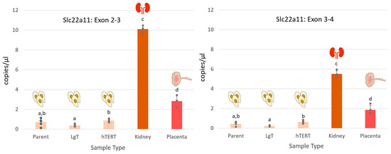 We pursued the possibility that Slc22a11 (mOat4) might be expressed in mouse RPTECs, encouraged by homologous alignments of Slc22a11 transcripts to mouse chromosome 19 from related rodent species (See Figure S1). Mouse-specific primers were designed from the four-exon predicted Slc22a11 transcript, Gm50435. We tested the total RNA isolated from mouse placenta and kidney, which are the primary organ tissues (n = 4 replicates) known for Slc22a11 expression [65,66]. The results of the ddPCR analysis, as shown in Figure 9, obtained with primers crossing the boundaries for exons 2–3, indicated the strongest signal at 10.1 ± 0.3 copies/µL in the kidneys and 2.8 ± 0.5 copies/µL for placenta. Primary cells and the LgT and hTERT cell lines exhibited low but detectable expression in the range of 0.5 to 1.0 copy/µL.