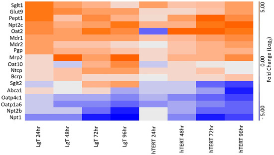 We wanted to determine whether the transcripts from some of the transporters presented in Figure 8 were inducible or downregulated in these two cell lines. To examine this question, we referred to our previous work for which hTERT and LgT cells were repeatedly exposed to CisPt in culture and then followed by RNA-seq, which was performed every 24 h over a span of 24–96 h [44]. Figure 10 shows the fold changes in the expression of 18 transporters appearing in Figure 8. Over half (14 of 18) of the transporters were inducible in both cell lines, with an earlier expression beginning at 24 h in LgT cells. Drug transporters Mdr1, Mdr2, Mrp2, Pgp, Bcrp, and Oat2 increased in expression in response to CisPt in our prior study. (Note that Oat2 was previously detectable in our earlier RNA-seq data.) However, some transcripts were increasingly downregulated from time-matched controls from 24 to 96 h in both cell types and included Oatp4c1, Oatp1a6, Npt2b, and Npt1. Also, hTERT cells showed that Sglt2 and Abca1 transcripts continued to decrease from 24 to 96 h.