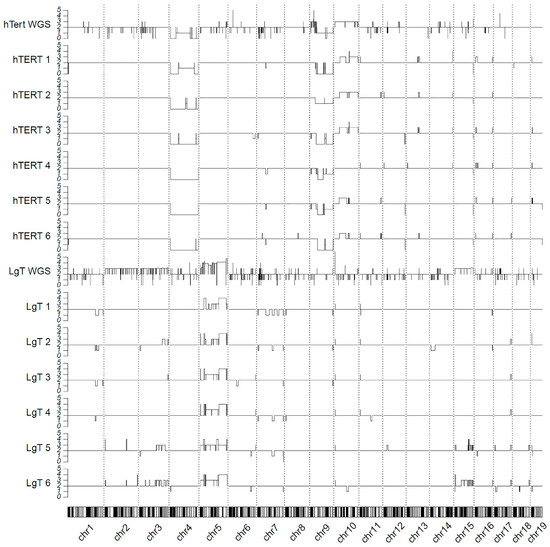 Chromosomal alterations from the parent cell line associated with immortalization in hTERT and LgT cells were assessed by whole-genomic sequencing (WGS) and RNA-seq of each cell type. WGS was conducted at an approximately 100× sequencing depth of 500–530 million read pairs each for parent, hTERT, and LgT cells that mapped at >95% to GRCm38-mm10. The estimates of the copy number variation (CNV) from the WGS were made using the CNVkit software [67]. Further, we made use of the expression values and B-allele frequencies (BAFs) from the RNA-seq reads with the CaSpER algorithm to estimate the CNV events across the genome [68]. The WGS and RNA-seq results are displayed using a karyotype map in Figure 11. For hTERT cells, the WGS shows the loss of major portions of chromosome 4, which is reflected in the RNA-seq data. Similarly, portions of chromosome 9 were also lost but not as extensively as chromosome 4. The WGS data also show some gains in chromosome 10 in hTERT cells, observed in five out of six RNA-seq samples. For LgT cells, the genomic data primarily indicate the largest increases in the copy number occurred in chromosome 5, as substantiated by increases in the transcriptomic data of each sample. It should be noted that minor variations in the sequencing depth in the RNA-seq data may account for some of the inter-sample differences in the CNVs for the hTERT and LgT cells.