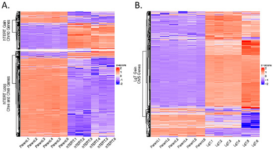 Cluster analysis of the expression differences for transcripts with chromosomal copy number variants (CNVs). Differential expression in hTERT and LgT cells from parent cells was determined for genes appearing on chromosomes 4, 9, and 10 in hTERT cells, as shown in Panel (A), and for genes on chromosome 5 in LgT cells, as shown in Panel (B). The base mean counts (BMCs) from the RNA-seq analysis for each transcript (n = 6/cell type) were compared by Z-score. The range in Z-score values is shown in the legend, located to the right of each panel. A hierarchical analysis was used to separate the expression data into seven clusters a., b., c., d., e., f., and g. See text for a detailed description.