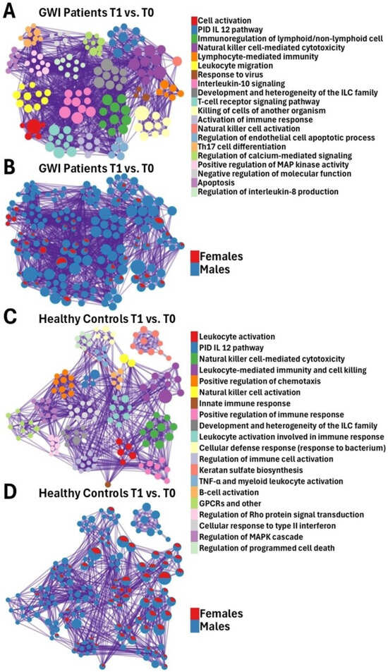 Metascape [] expression analysis of DEGs between male and female GWI patients (A,B) and HCs (C,D) between T1 and T0. Each node represents an enriched term (A,C). The larger the representation of color, the more enriched it is in each cohort. Cutoff values included a p-value < 0.01, a minimum count of 3 in the list of differentially expressed genes, and an enrichment factor of >1.5. GO biological processes, KEGG pathways, Reactome gene sets, CORUM complexes, and canonical pathways from MSigDB were included in the search; (B,D) nodes are colored by ratios between male (blue) and female (red) participants. The size of the nodes is proportional to the z-score calculated by Metascape [].