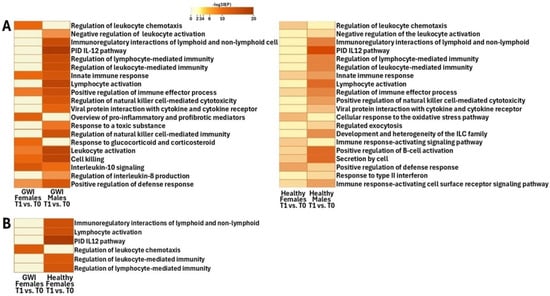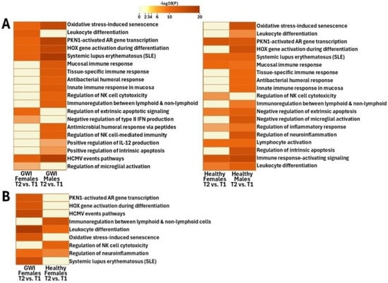 Functional pathway analysis conducted on DEGs between male and female GWI cohorts at T2 and T1 demonstrated significant changes between the sexes (Figure 3A,B and Figure 4A). In the male GWI cohort, unlike females, pathways of high significance included those associated with the mucosal immune response, tissue-specific immune response, antibacterial humoral response, immunoregulatory interactions between a lymphoid and a non-lymphoid cell, regulation of NK cell-mediated immunity and cytotoxicity, positive regulation of IL-12 production, and positive regulation of the intrinsic apoptotic signaling pathway (Figure 4A).