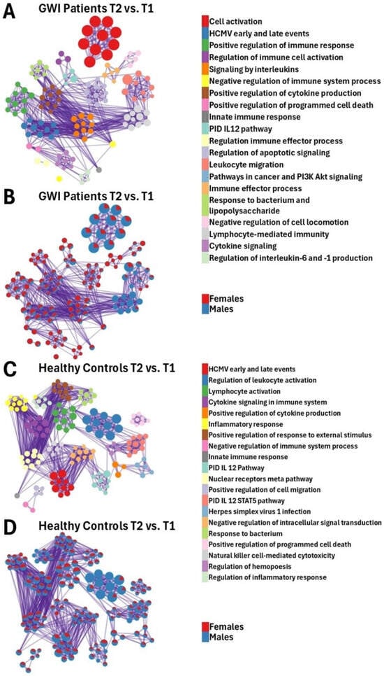Metascape [] expression analysis of DEGs between male and female GWI patients (A,B) and HCs (C,D) between T2 and T1. Each node represents an enriched term (A,C). The larger the representation of color, the more enriched it is in each cohort. Cutoff values included a p-value < 0.01, a minimum count of 3 in the list of differentially expressed genes, and an enrichment factor of >1.5. GO biological processes, KEGG pathways, Reactome gene sets, CORUM complexes, and canonical pathways from MSigDB were included in the search; (B,D) nodes are colored by ratios between male (blue) and female (red) participants. The size of the nodes is proportional to the z-score calculated by Metascape [].
