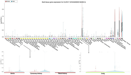 To understand the tissue-wide distribution of Cldn17 in humans, we analyzed the Genotype–Tissue Expression (GTEx) portal (https://www.gtexportal.org/home/, accessed on 8 March 2025). The data revealed high expressions of Cldn17 in tissues such as the salivary gland, esophagus, vagina, cervix, testes, and skin (Figure 1), whereas while tissues such as the aorta, coronary artery, tibial artery, lung, kidney, and several other organs did express Cldn17, the expression levels were generally lower (Figure 1).