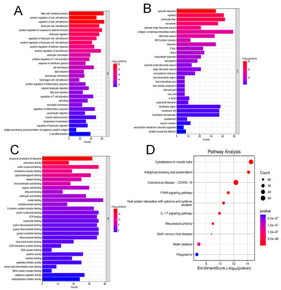 GO analysis of cellular components (Figure 5B) highlighted enrichment in cytosolic ribosomes, extracellular matrix organization, and host cell components, suggesting alterations in cellular structure and interactions. Similarly, molecular function analysis (Figure 5C) identified significant enrichment in structural constituent proteins, receptor binding, and nucleotide binding functions, indicating changes in cellular communication and metabolic activity. KEGG pathway analysis (Figure 5D) confirmed key enrichment in antigen processing and presentation, IL-17 signaling, and pathways related to immune disorders such as rheumatoid arthritis and graft-versus-host disease. Notably, viral protein interactions with cytokine receptors and coronavirus-related pathways were also enriched, suggesting potential interactions with the host’s immune responses.