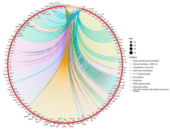 A circular chord diagram was generated to visualize the functional enrichment of DEGs (Figure 6). This analysis highlights several biological pathways significantly associated with the gene expression changes observed in the Cldn17−/− lungs. Each pathway is represented by a unique color, with connections illustrating the involvement of specific genes within these pathways.