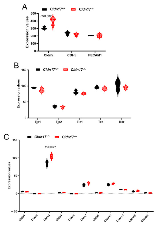 Cldn17 deficiency had no major impact on the expression of other cell–cell junction proteins in mouse lungs. (A) Violin plots showing changes in the expression of the major endothelial junctional and adhesion proteins Cldn5, Cdh2, and Pecam1 between the Cldn17+/+ and Cldn17−/− mouse lungs. (B) Violin plots showing expression levels of the major endothelial markers Tjp1/Tjp2, Tie1, Tek, and Kdr between the Cldn17+/+ and Cldn17−/− mouse lungs. (C) Violin plots showing no changes in the expression of other claudin isoforms in the Cldn17−/− mouse lungs as compared to the Cldn17+/+ mouse lungs. n = 3; Data are presented as mean ± SEM.