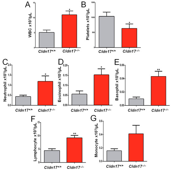 Loss of Cldn17 causes leukocytosis. Bar graphs showing (A) WBCs (n = 7), (B) differential count (n = 7), and (C) platelets (n = 8) in the Cldn17−/− vs. Cldn17+/+ mice. (D–G) Bar graphs showing increased eosinophil, basophil, total lymphocytes and monocytes in Cldn17−/− vs. Cldn17+/+ mouse blood, respectively (n=7). Data are presented as mean ± SEM; WBC, white blood cells; * p < 0.05; ** p < 0.01.