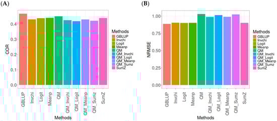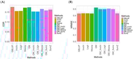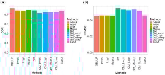 Figure 1 presents the results for the Disease dataset under a comparative analysis of the GBLUP, Invchi, Logit, Meanp, Sumz, QM, QM_Invchi, QM_Logit, QM_Meanp, QM_Sumz, and Sumz models in terms of their predictive efficiency measured by COR and NRMSE. For more details, see Table A1 (in Appendix A).