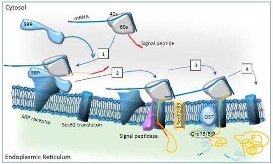 This complex includes Sec61α, Sec61β, and Sec61γ subunits, along with accessory proteins like Sec62, Sec63, and the TRAP (translocon-associated protein) complex, which aid in ribosome recruitment and protein translocation []. Hsp70 and its ER-resident counterpart BiP (Grp78) prevent substrate misfolding and assist in translocation []. Whereas Hsp70 prevents the misfolding of translocated substrates in the ER lumen, BiP directly acts in the translocation process, as described below [,,,].