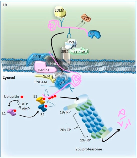 Oligosaccharyltransferase (OST) initiates N-linked glycosylation of specific asparagine residues, then binds to the ribosome–Sec61–TRAP complex []. Interestingly, the ER translocon is involved in the UPR []. Glycosylation intermediates (Glc3Man9GlcNAc2, Glc2Man9GlcNAc2, Glc1Man9GlcNAc2) are trimmed by glucosidases I and II, enabling lectin-like proteins to direct CFTR into the calnexin/calreticulin (CNX/CRT) cycle, where it undergoes further folding and quality control [,,]. Protein disulfide isomerase (PDI) catalyzes disulfide bond formation to stabilize CFTR [,]. After exiting the CNX/CRT cycle, CFTR can undergo one of three fates []: correctly folded CFTR progresses to the Golgi for further glycosylation, incompletely folded CFTR re-enters the CNX/CRT cycle via UDP–glycoprotein glycosyltransferase (UGT) [,,], or misfolded CFTR is degraded via ER-associated degradation (ERAD) [,,,,]. ERAD [,] is a pre-Golgi proteolysis pathway targeting misfolded proteins [,,]. It relies on the ubiquitin–proteasome system, which can be divided in four distinct coupled steps: (1) unfolded protein recognition, (2) translocation across the lipid bilayer, (3) addition and then removal of polyubiquitin, and (4) degradation by the 26S proteasome. The second step takes place through dislocons, aided by adaptors recognizing glycan modifications or misfolded regions. Membrane glycoproteins with lumen-exposed domains are often targeted for ERAD via OS-9/XTP3-B. SEL1L, an ER-resident glycoprotein, bridges substrate recognition factors to the Hrd1 complex [,,,,]. Dislocon components like Derlin-1, Derlin-2, AUP1, UBXD8, VIMP, and Herp facilitate this process [,,,]. SEL1L transfers substrates to Hrd1, an E3 ubiquitin ligase, which targets them for degradation. Dislocon components such as Derlins [], E3 ligase Hrd1 [], signal peptide peptidase [], and Sec61 [] interact with ERAD substrates for dislocation. Once in the cytoplasm, substrates are ubiquitinated, preventing their return to the ER lumen and increasing their affinity for the p97 complex []. Ubiquitin recognition factors and cofactors form complexes with p97, mediating substrate extraction [,]. The Hrd1 complex directly recruits p97 to dislocation sites, aiding in substrate capture and translocation to the cytoplasm [,]. Finally, gp78 recruits p97 complexes by interacting with p97 [,], delocalizing and unfolding the misfolded proteins into the cytoplasm. During the third step, unfolded or misfolded proteins are ubiquitinated in the cytoplasm. Ubiquitin (Ub), a small protein, can form mono- or polyubiquitin chains. This process involves E1, E2, and E3 enzymes, as well as E4 [,]. E1 activates Ub in an ATP-dependent manner, transferring it to E2. E2 binds to E3, which promotes ubiquitin transfer to the substrate. E4 further extend the ubiquitin chain. UBA1 is the major E1 enzyme, initiating most ubiquitination reactions []. ERAD-related E2 enzymes link ubiquitin to E3 enzymes and participate in the degradation of ERAD components, ensuring quality control. The final step in the ERAD pathway is the degradation of misfolded and ubiquitinated proteins delivered to the 26S proteasome. The 26S proteasome consists of a 20S core particle (CP) and two 19S regulatory particles (RPs). The 19S RP recognizes polyubiquitinated proteins, unfolds them, and controls their entry into the 20S CP(82). The 20S CP hydrolyzes the unfolded protein. After degradation, the proteasome returns to its inactive state [,]. The ERAD process is summarized in Figure 2.